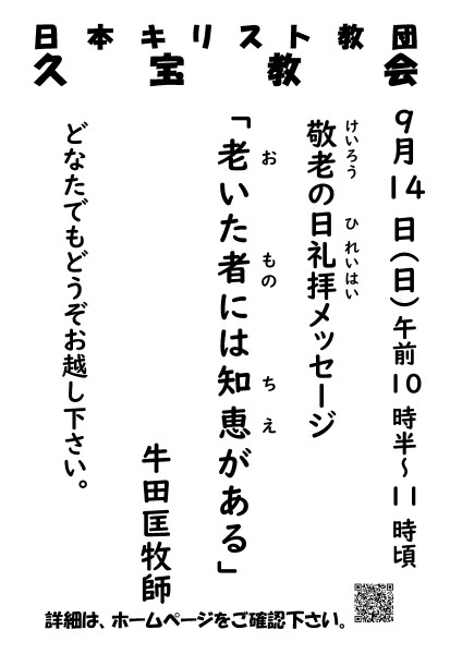 ホーム > お知らせ お知らせ内容 9月14日 敬老の日礼拝予告 2025/09/07(日) 2025年9月14日の「敬老の日」礼拝の予告です。聖書 列王記 上 3章5-14節メッセージ「老いた者には知恵がある」牛田匡牧師 <<戻る