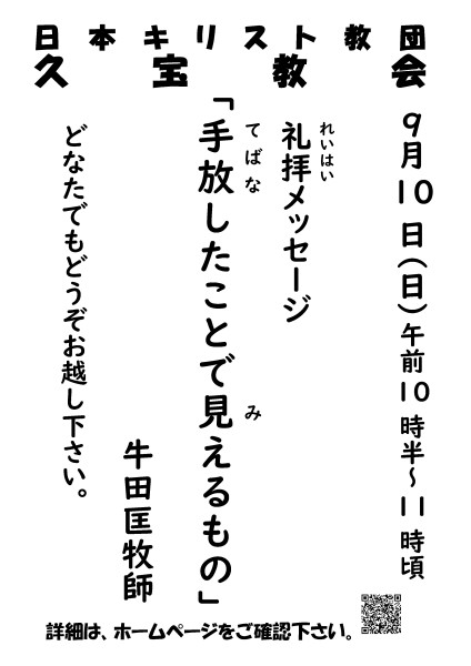 ホーム > お知らせ お知らせ内容 9月10日 礼拝予告 2023/09/03(日) 9月10日の礼拝予告です。聖書 ルカによる福音書 14章 25-35節メッセージ「手放したことで見えるもの」 牛田匡牧師 <<戻る
