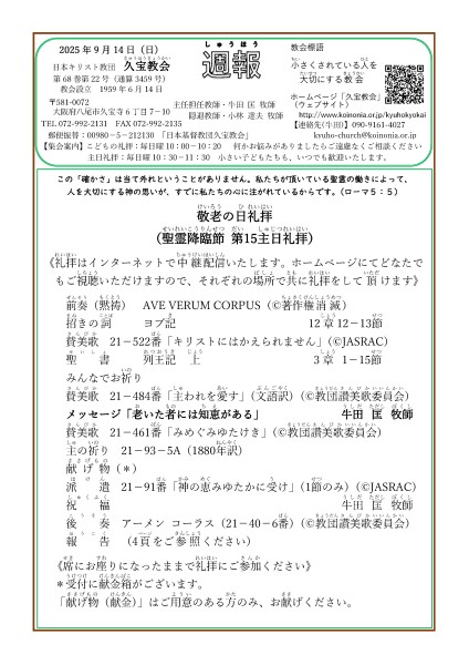 2025年9月14日の「敬老の日」礼拝のお知らせです。