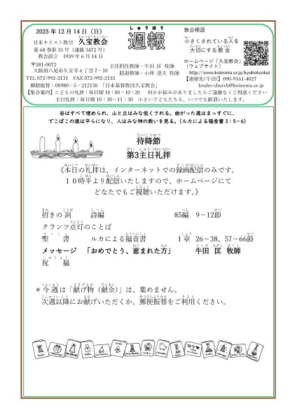 2025年12月14日は、会堂での礼拝は休会(閉室)です。