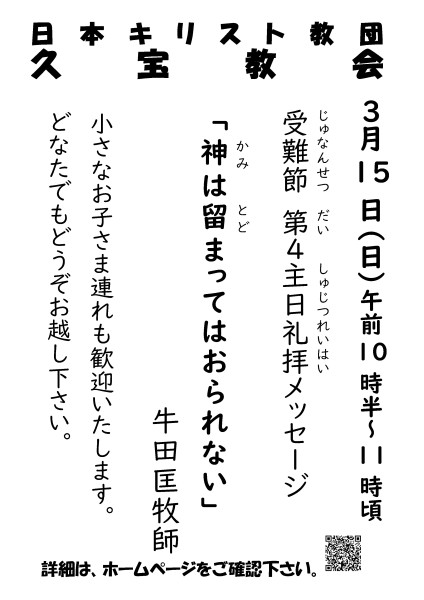 ホーム > お知らせ お知らせ内容 3月15日 礼拝予告 2026/03/08(日) 2026年3月15日 受難節第4主日の礼拝予告です。聖書 マルコによる福音書 9章 2-13節メッセージ「神は留まってはおられない」 牛田匡牧師 <<戻る