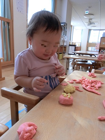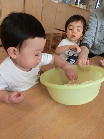小麦粉を使っての粘土の感触あそびをしました。粉から触ってみて、水を入れるとベタッとした感触に「なんだ?これ~。」と手を引っ込める子どももいます。初めは慎重でしたが、ちぎったり、指で押したりと形が変わることを楽しんでいました。次はおからでしょうかなぁと保育者は考えていました。2月5日(水)