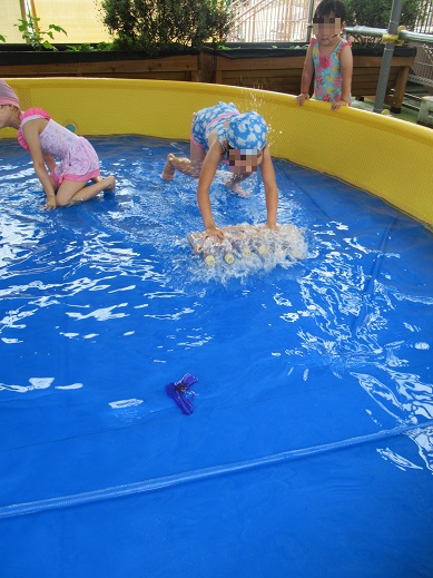7月は雨の多い日が続いています。その合間を大事にして感触遊びをを楽しんでいます。色水遊びでは2色の色を合わせるとこんな色になったと歓声を上げています。プールの中での水遊びでは水鉄砲で遊んだり、ペットボトルにジョウゴを使って水を入れたりしています。泡遊びではスポンジを使って泡立てます。そして、カップに入れたり、身体につけてお風呂ごっこをしたりと楽しみ、色水が出てくるとジュース屋さんごっこが始まり、友だちがもらいに行きます。バディペイントもして、どんどんと遊びが広がり、夢中になっていました。