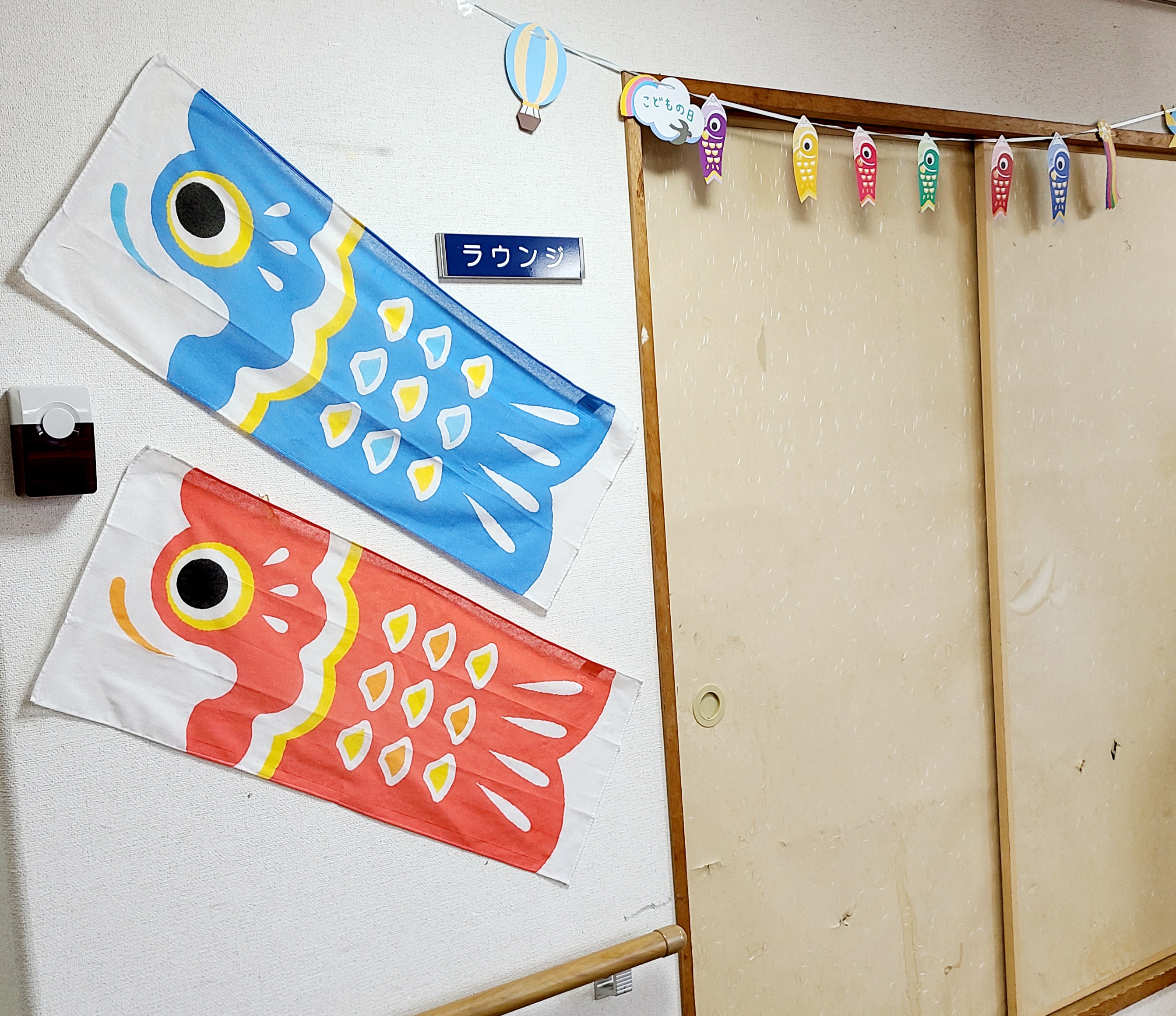 エレベーターの中には、皆さんと一緒に作った鯉のぼり晴れ