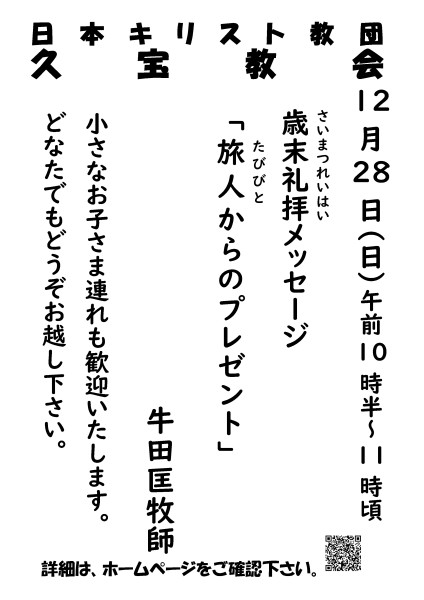 ホーム > お知らせ お知らせ内容 12月28日 歳末礼拝の予告 2025/12/22(月) 2025年12月28日 歳末礼拝の予告です聖書 マタイによる福音書 2章 1-12節メッセージ 「旅人からのプレゼント」牛田匡牧師 <<戻る