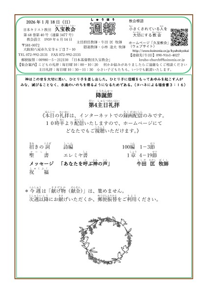 1月18日 礼拝YouTube配信のお知らせ