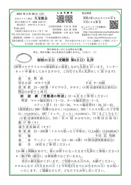 教会では、新型コロナウイルス感染予防に留意しながら礼拝をいたしますが、それぞれの方の体調にご注意いただいて、教会堂に共に集まって礼拝する形にこだわらずに、インターネットの中継配信を利用した在宅での礼拝など、それぞれの方が参加しやすい形で礼拝に参加ください。どうぞよろしくお願いいたします。