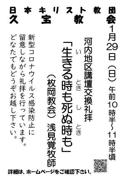 ホーム > お知らせ お知らせ内容 1月29日 講壇交換礼拝予告 2023/01/22(日) 1月29日の河内地区有志教会講壇交換礼拝の予告です。聖書 ローマの信徒への手紙 14章 7-9節メッセージ 「生きる時も死ぬ時も」浅見覚牧師(枚岡教会) <<戻る
